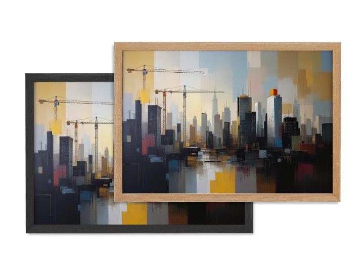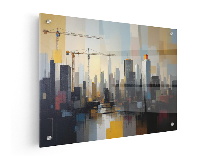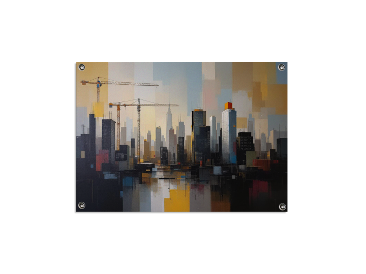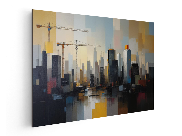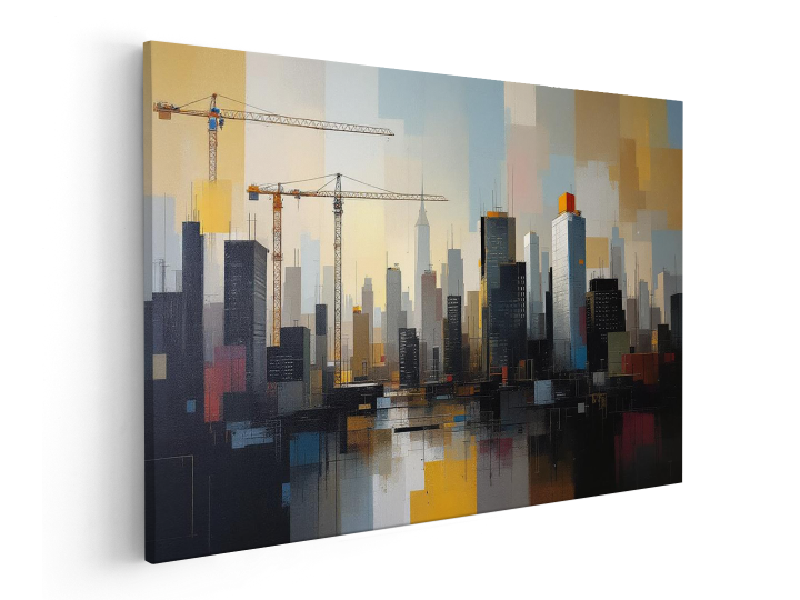 Een geometrisch abstract schilderij van een skyline van een stad die onder constructie is, met hijskranen en gebouwen die nog niet af zijn, met een interessant kleurenpalet, met grote contrasten, en dikke verf impasto texturen.