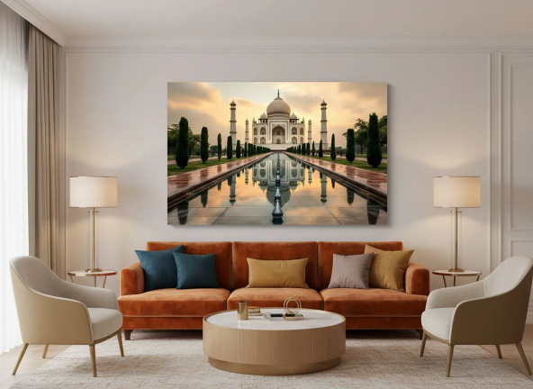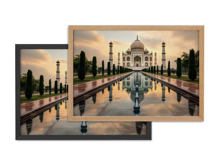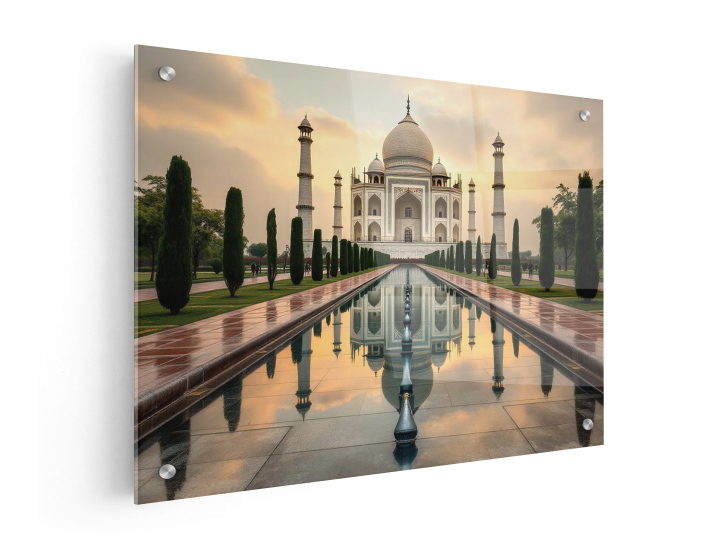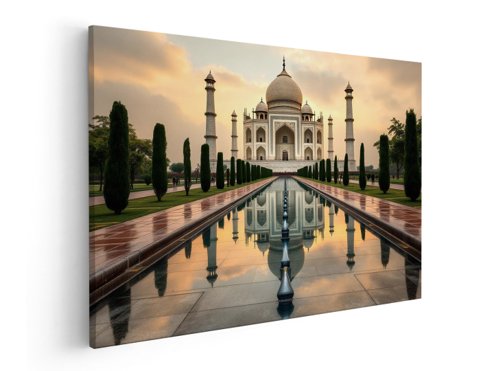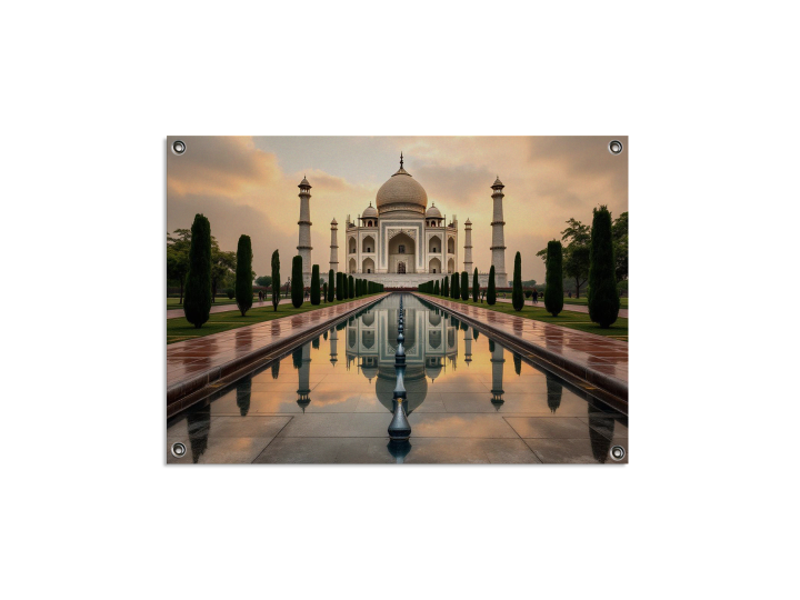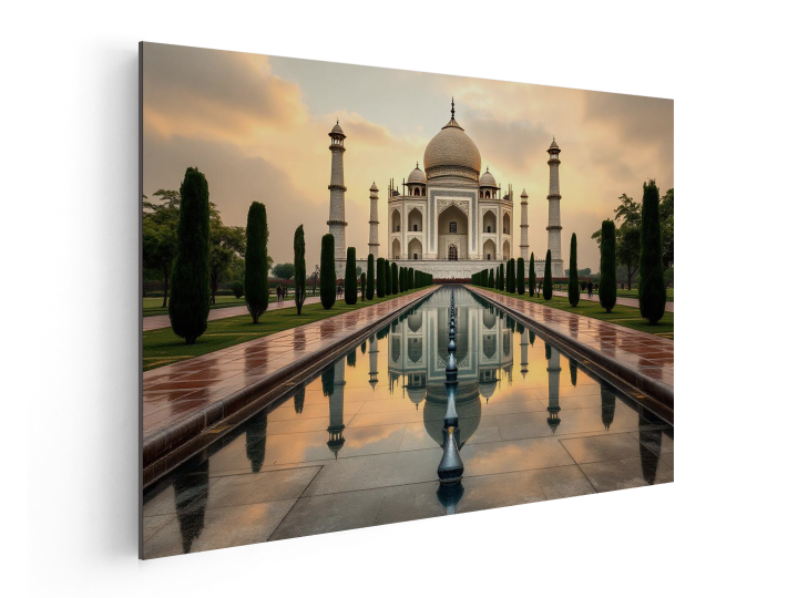 Hyper-realistische foto van de Taj Mahal na een lichte regenbui, perfecte symmetrische reflectie in de natte marmeren vloer, zachte bewolkte lucht met warm licht, rustige en tijdloze uitstraling, extreem scherpe details, cinematografische compositie, professionele architectuurfotografie, museumwaardige fine art wandprint.