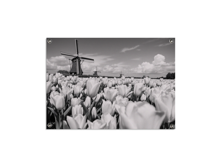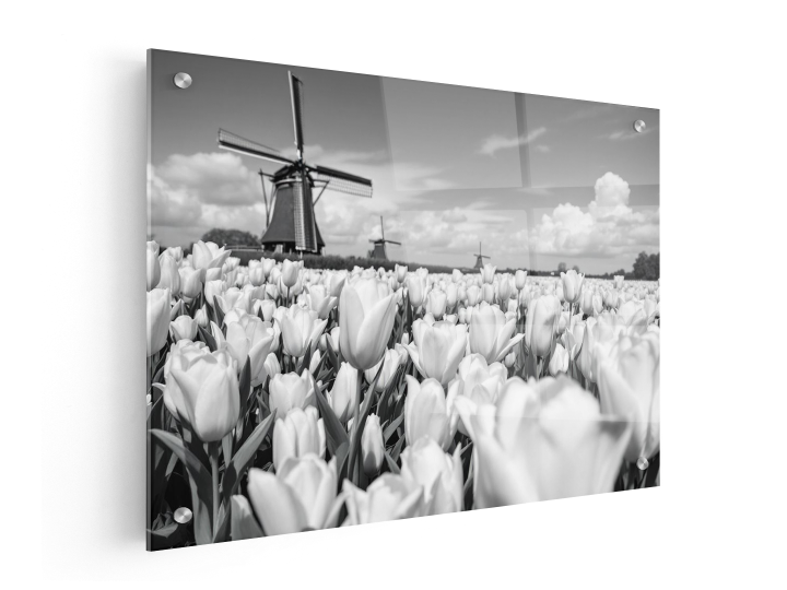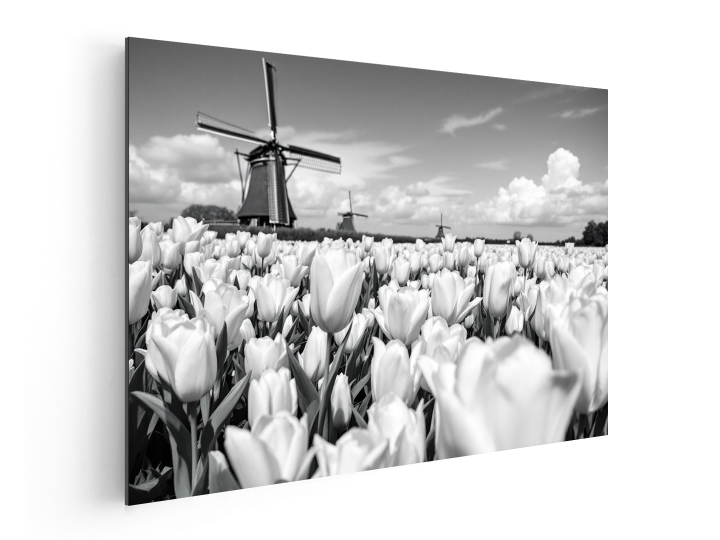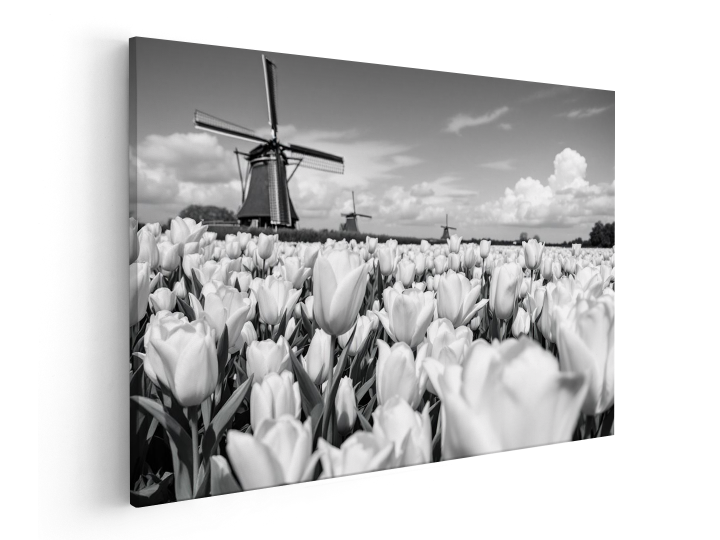 een ultra realistische professionele zwart en wit foto van Nederlands tulpenvelden, en molens in de achtergrond, met prachtige lichte tinten, modern en rustig qua contrast, met prachtige lichtinval en lucht effecten, met prachtige gevormde wolken, en uitmuntende details in iedere bloem, en geweldige kwaliteit en scherpte.