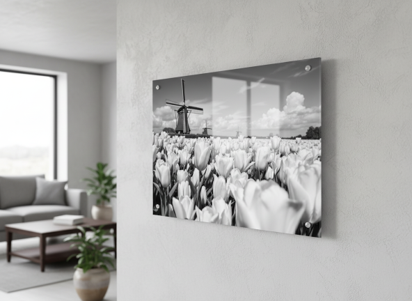 Plexiglas zorgt voor een mooie weerspiegeling, maar is niet transparant door de witte folie aan de achterzijde. Deze folie hoef je dus niet te verwijderen bij het ophangen. Bij fotorealistische prints geeft dit een bijzonder fraai effect, maar uiteraard staat het luxe en modern bij al onze designs -- ook bij de designs die je zelf hebt gemaakt.