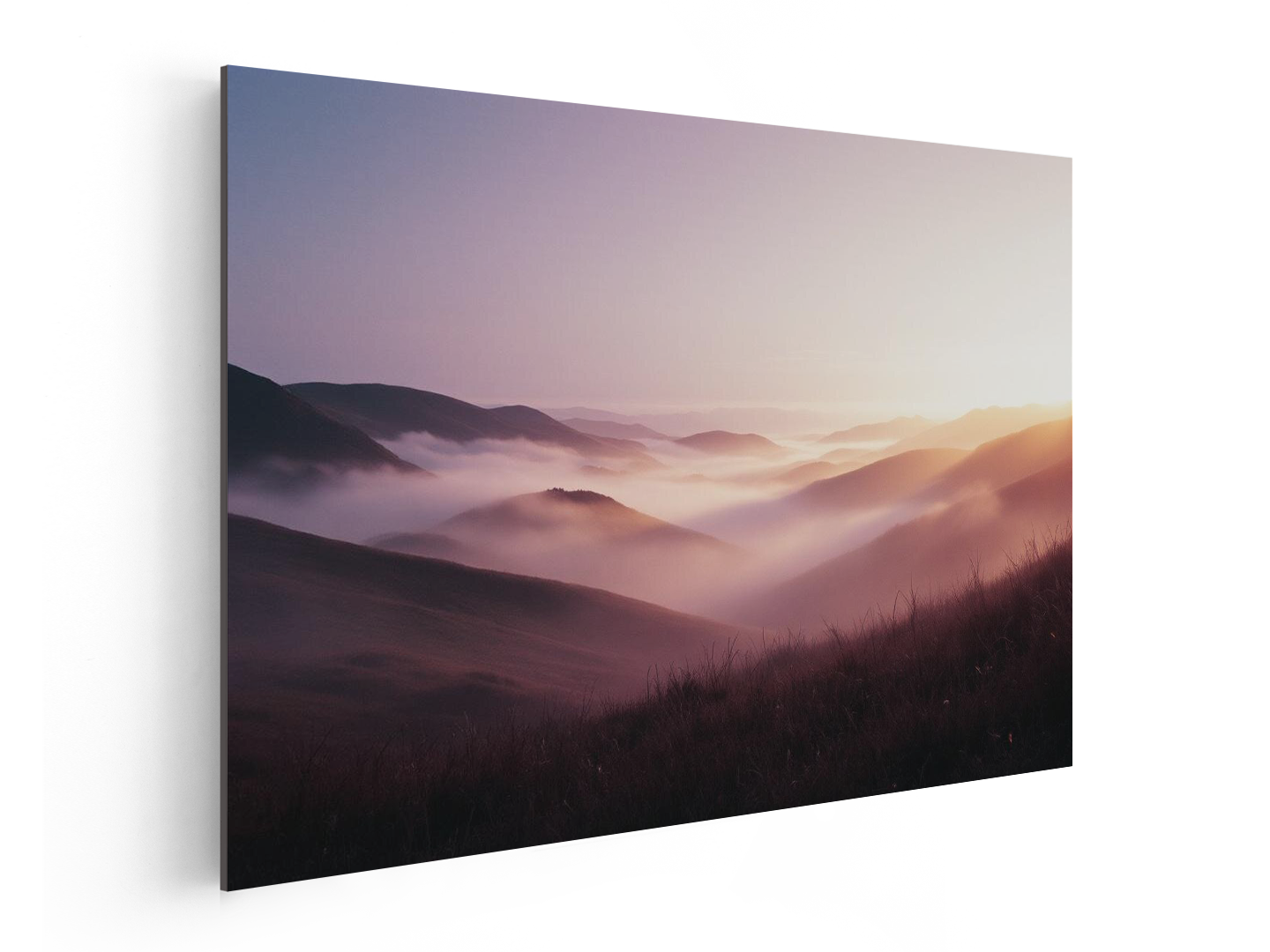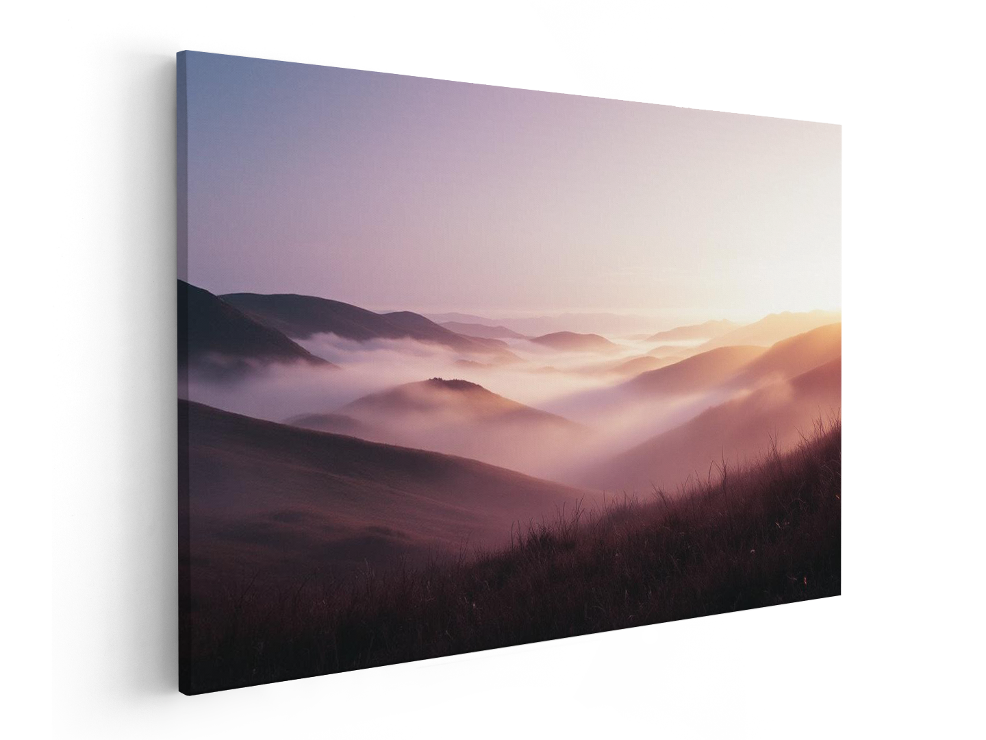 Mistig valleilandschap bij zonsopgang, laaghangende mist tussen de heuvels, zacht diffuus licht, pastelkleuren, diepe atmosferische waas, matte film look, kalme en serene sfeer, realistische landschapsfotografie.