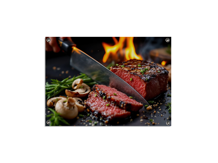 Een professionele keukenfoto van een premium stuk gegrild wagyu-rundvlees, doorgesneden met een traditionele Japanse tanto, met shiitake-champignons en edamamebonen eromheen, tegen een donkere achtergrond met een paar vlammen.