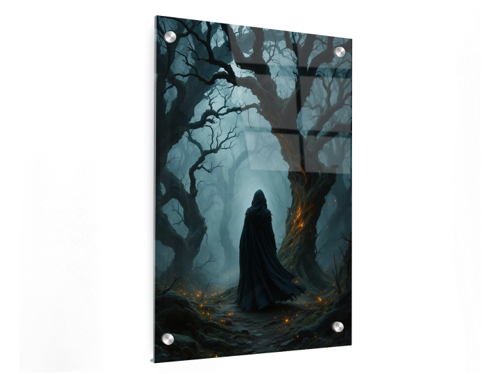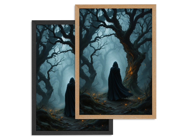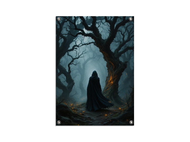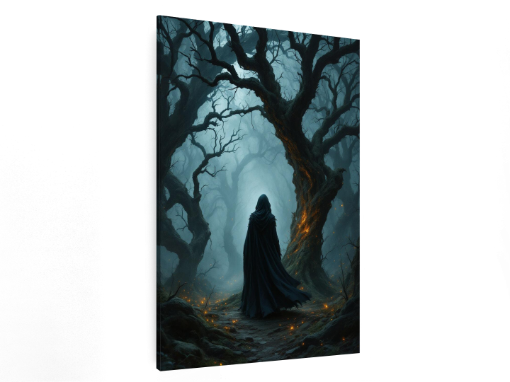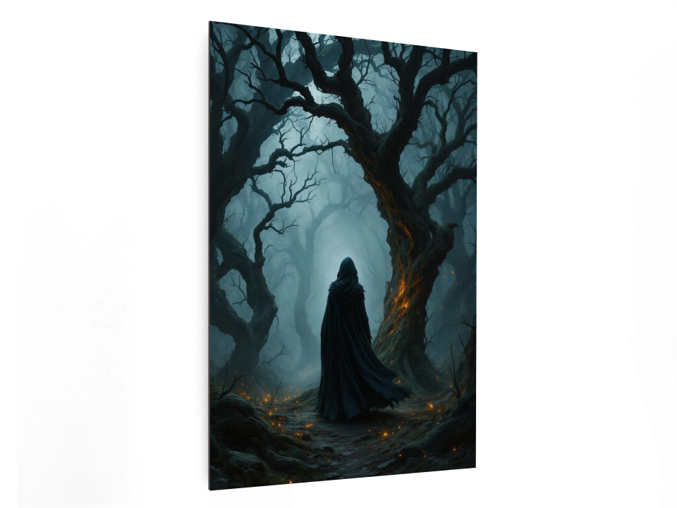 Een gemaskerde zwerver loopt door een vervloekt bos vol kronkelende bomen, zwakke gloeiende kooltjes drijven door de mist, zachte randverlichting, schilderachtige schaduwen, filmische diepte, stemmige, duistere fantasy-muurdecoratie.