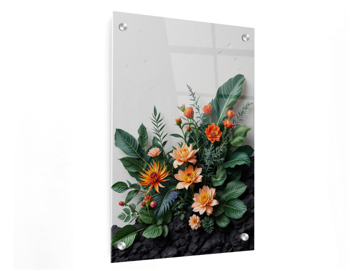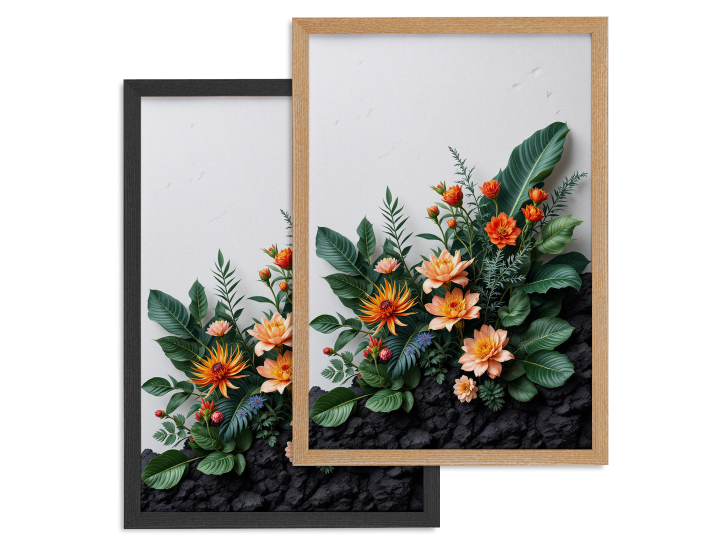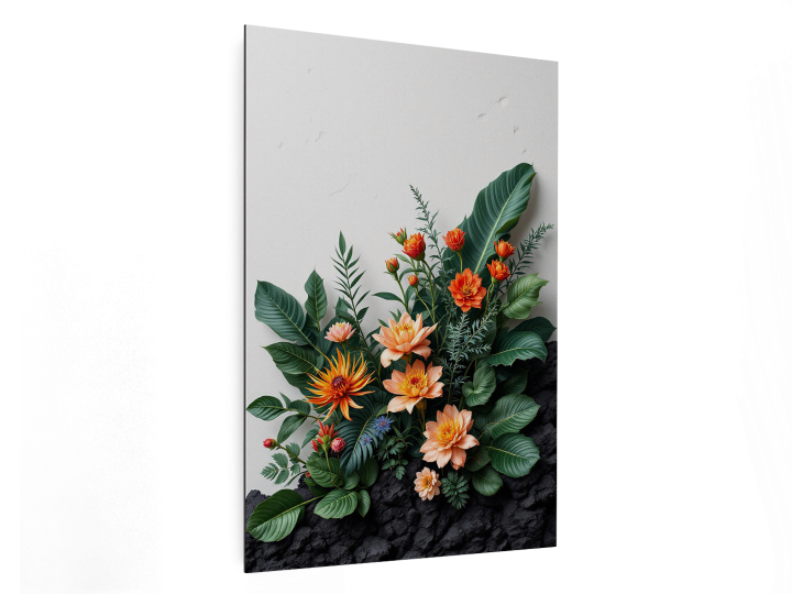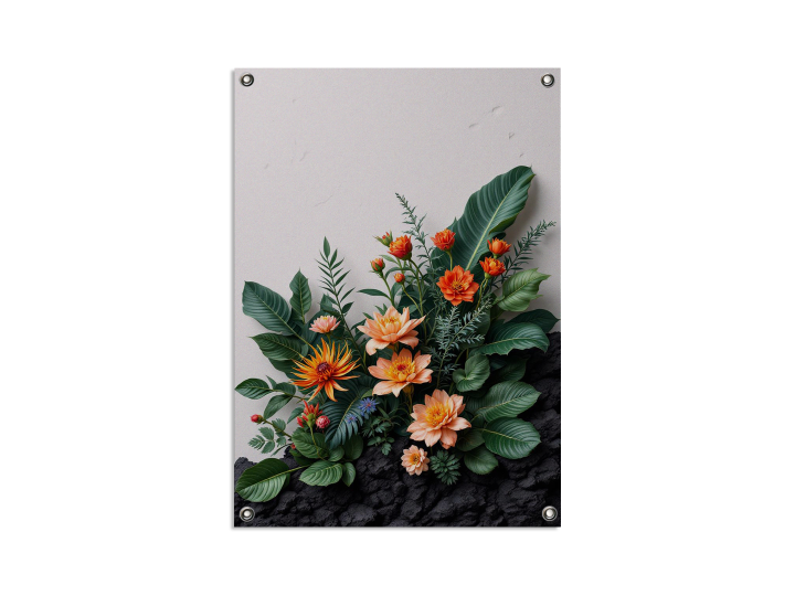 Een krachtige botanische compositie met robuuste tropische planten en delicate bloemen, kleurenpalet van lava-oranje, diep zwart en smaragdgroen, ruwe textuur achtergrond geïnspireerd op vulkanisch gesteente, dramatische sfeer, ultra high detail, fine art wanddecoratie.