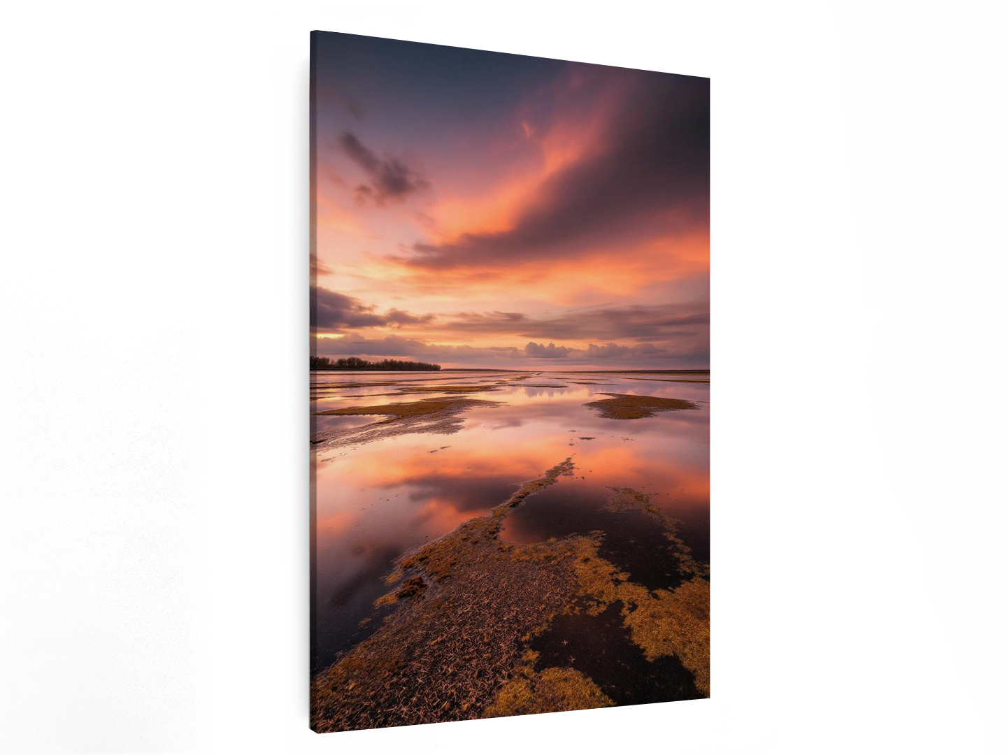 Een prachtige en epische professionele landschap foto van het wadden gebied in Nederland, waarbij je een lange oversteek ziet in het lage tij/ eb, creëer perspectief en diepte met een prachtig gekleurd lucht.