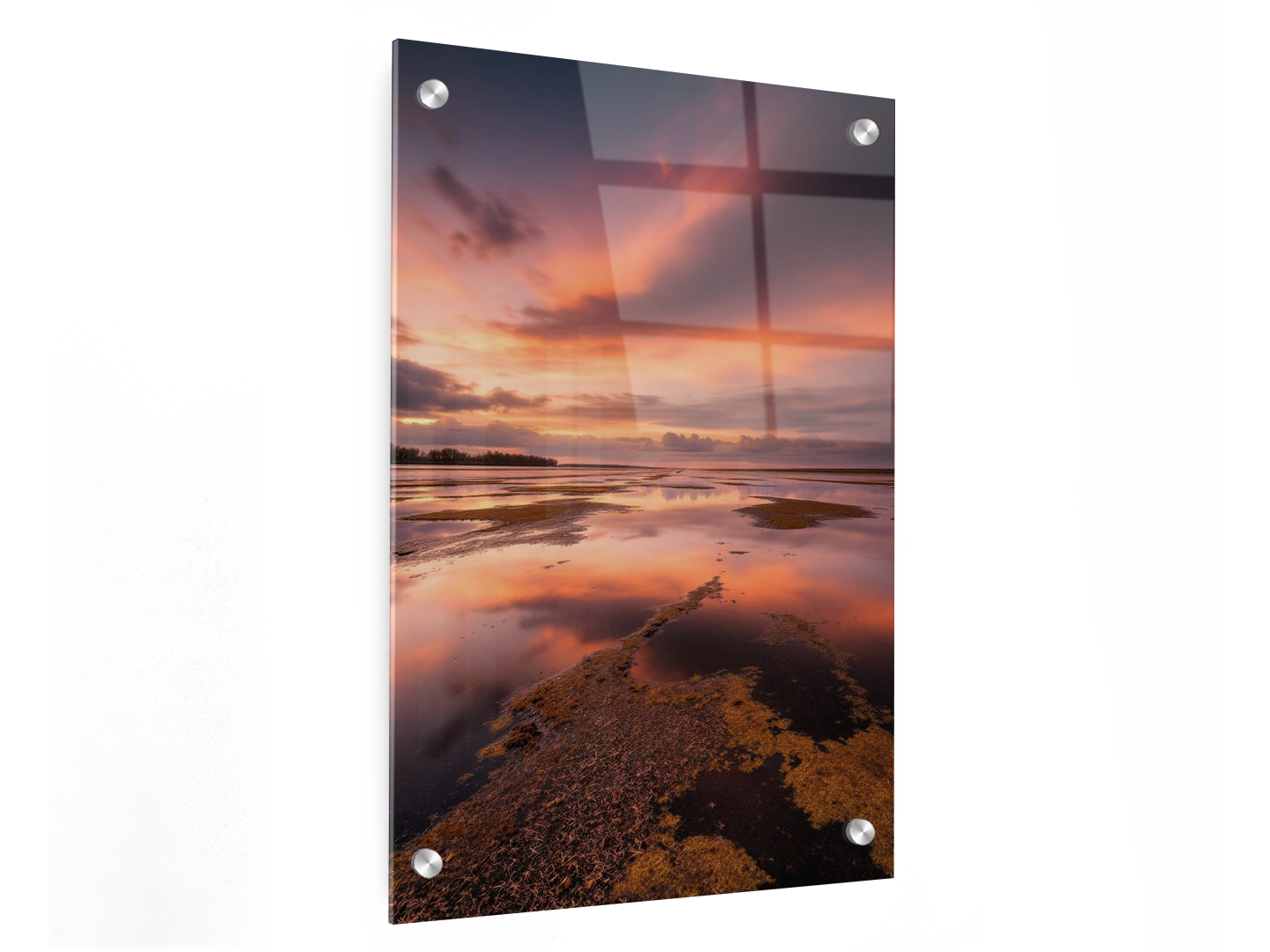 Plexiglas zorgt voor een mooie weerspiegeling, maar is niet transparant door de witte folie aan de achterzijde. Deze folie hoef je dus niet te verwijderen bij het ophangen. Bij fotorealistische prints geeft dit een bijzonder fraai effect, maar uiteraard staat het luxe en modern bij al onze designs -- ook bij de designs die je zelf hebt gemaakt.