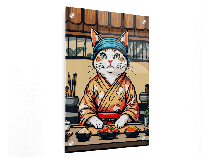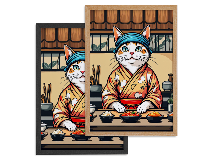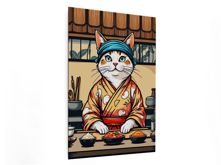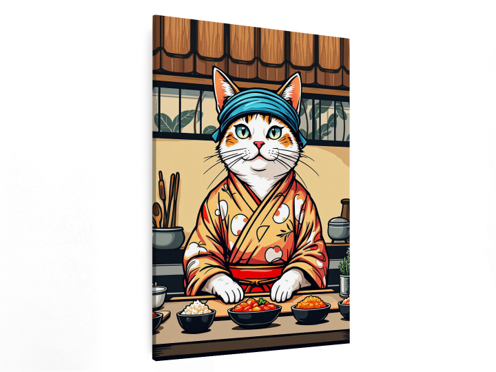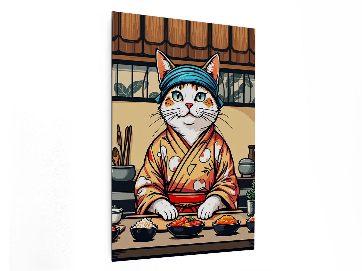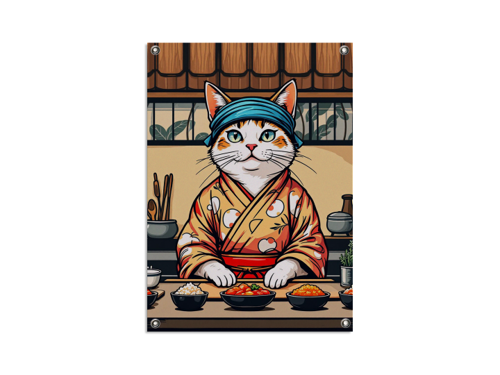 Een gestileerde katten-sushichef in kimono en met een hoofdband, staand achter een sushibar, gedurfde vectorillustratie, levendige kleuren, dikke contouren, moderne Japanse posterkunst, neo-ukiyo-e stijl, tatoeage-geïnspireerd ontwerp, symmetrische compositie, beige achtergrond, beperkt kleurenpalet, schattige maar zelfverzekerde uitdrukking, grafische illustratie, esthetiek van een t-shirt ontwerp.