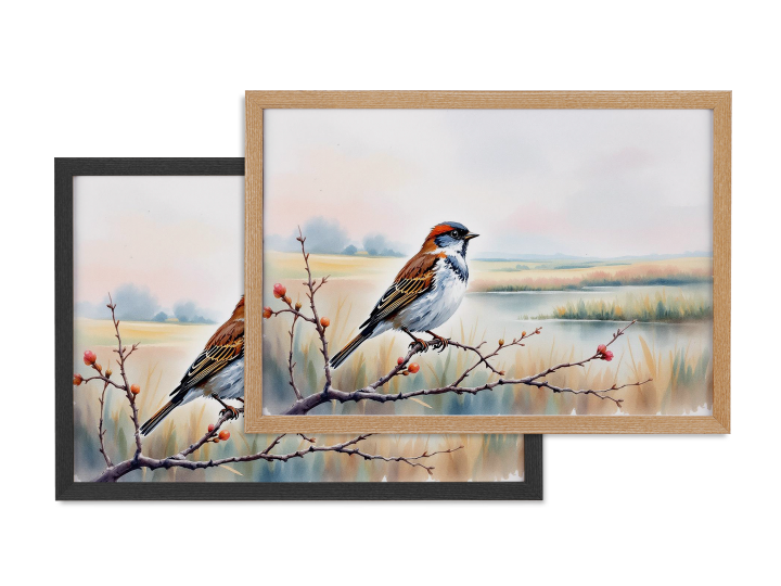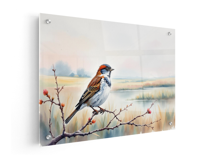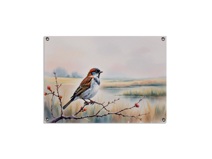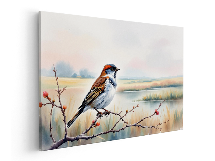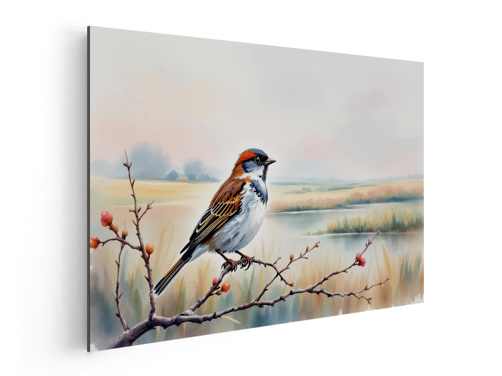 een waterverf schilderij van een prachtig en rustgevend Nederlands landschap, met een vogel op de voorgrond, zittend op een tak, met mooie pastel en aquarel effecten en kleuren, met geweldige kwaliteit.