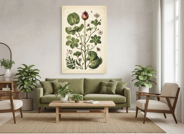 Dit is een design van onze botanische kunst collectie. De kracht van botanische wanddecoratie zit in de eenvoud. Natuurlijke vormen, zachte kleuren en subtiele details brengen een rustige, frisse sfeer in huis. Onze botanische prints zijn ontworpen om een gevoel van balans en warmte te creëren. Ze passen perfect binnen moderne en Scandinavische interieurs en zorgen voor een natuurlijke uitstraling zonder dat het druk wordt. Of je nu een lege muur wilt opvullen of een ruimte meer leven wilt geven, botanische kunst is een veilige maar stijlvolle keuze die altijd werkt. Je kunt dit design eenvoudig aanpassen, variaties maken of zelf tweaken zodat het perfect aansluit bij jouw interieur.