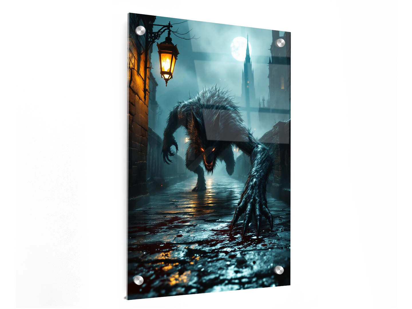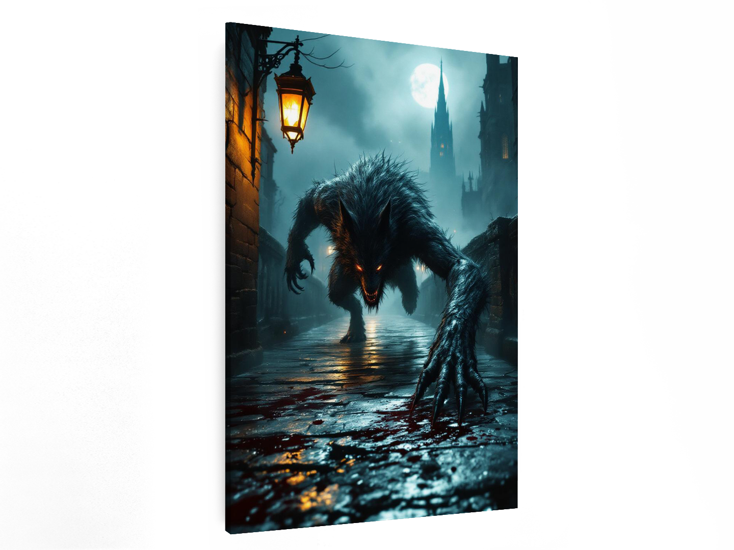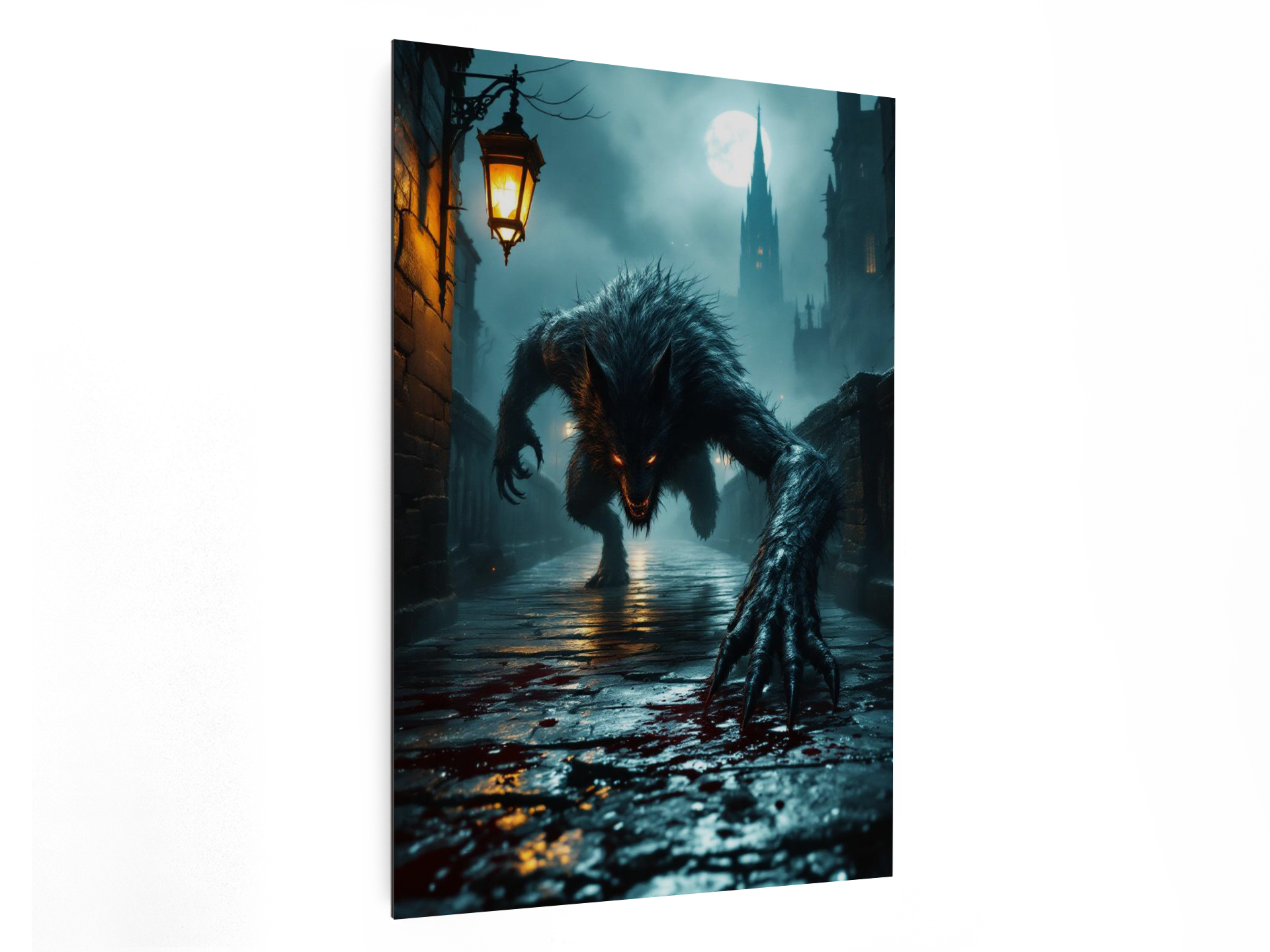 Een donkere, gotische stenen brug ’s nachts die leidt naar een torenhoge kathedraalspits in de verte, dichte, rollende mist en zwak lantaarnlicht dat reflecteert op natte straatstenen, op de voorgrond een gebroken glazen bloedflacon op de grond met vers bloed dat zich over de stenen verspreidt, een groot maar slank wolfachtig beest kruipt en springt naar de kijker toe in een dynamische, agressieve houding, klauwen uitgestrekt, bewegingsonscherpte op het wezen, dramatisch laag perspectief, grimmige Victoriaanse horroratmosfeer, subtiele kosmische horrorondertonen, volumetrisch maanlicht dat door de mist snijdt, zwevende asdeeltjes, sterke randverlichting, filmische scherptediepte, schaduwen met hoog contrast, schilderachtige gotische textuur, epische horrorpostercompositie, hoogwaardige metalen posteruitstraling, ultragedetailleerde, galerijwaardige donkere fantasy muurdecoratie.