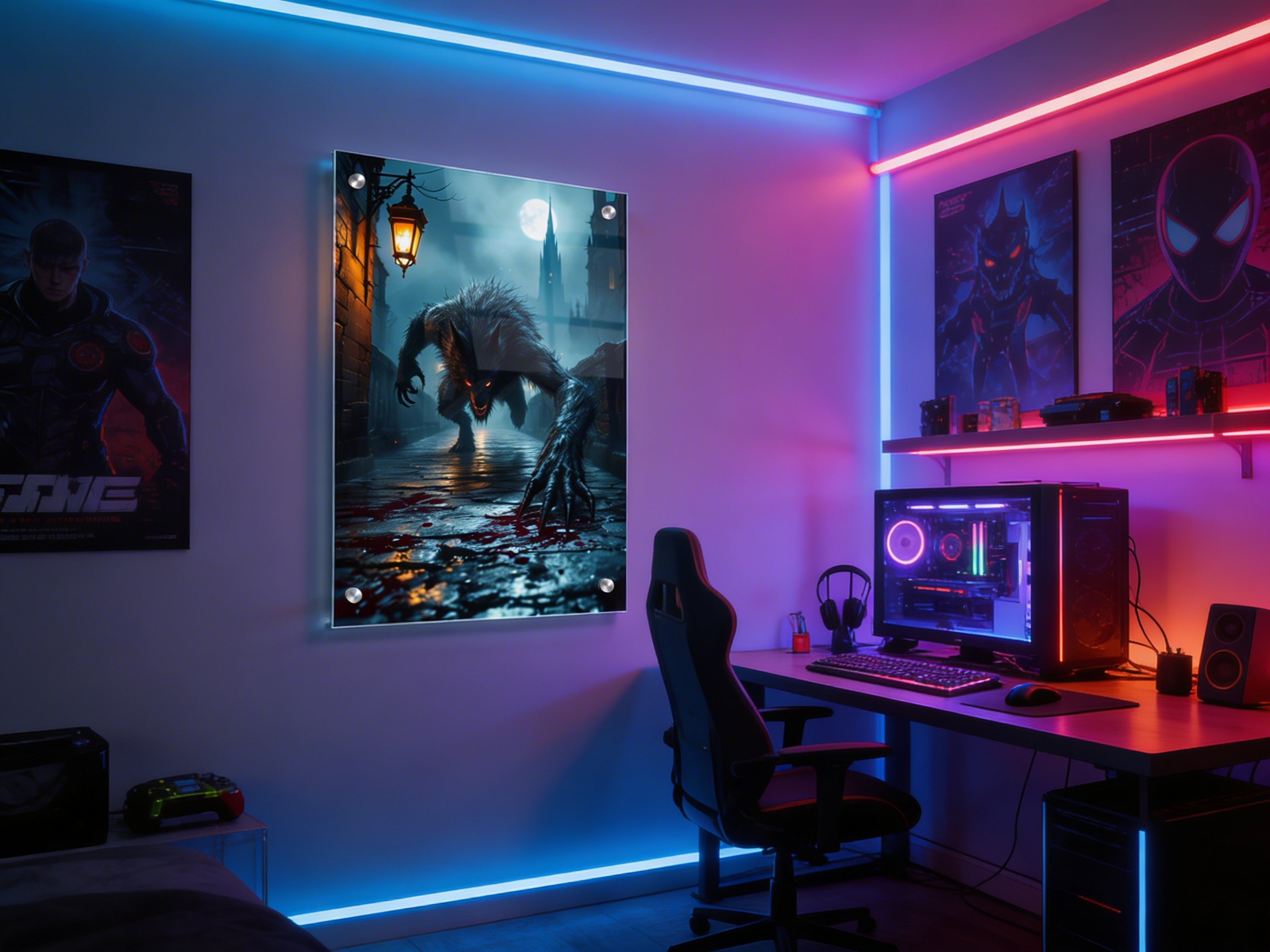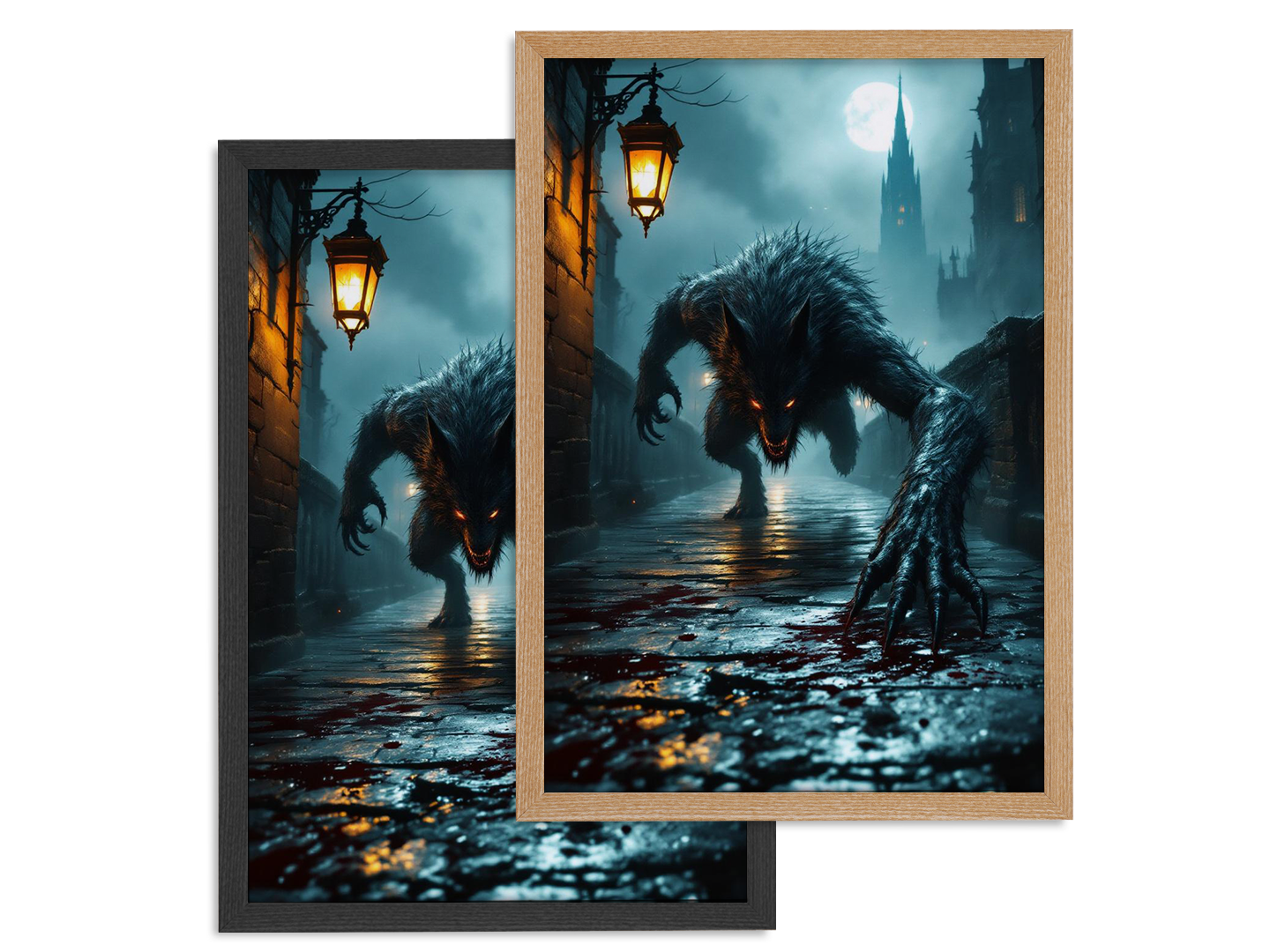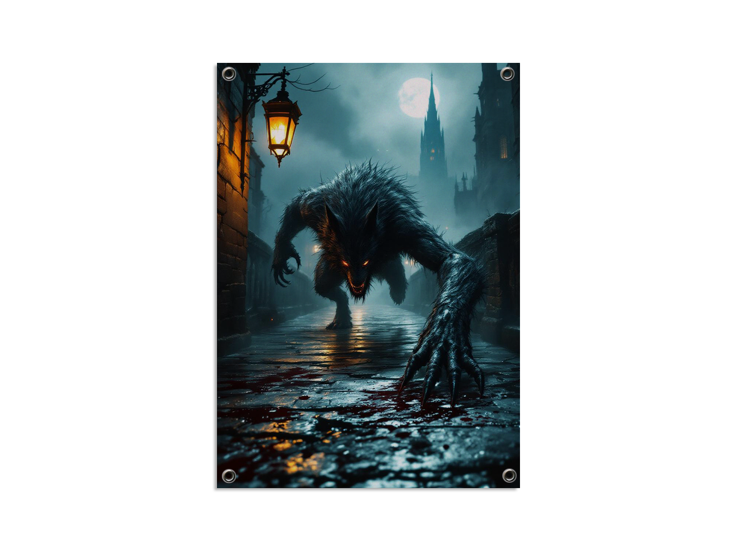 Een donkere, gotische stenen brug ’s nachts die leidt naar een torenhoge kathedraalspits in de verte, dichte, rollende mist en zwak lantaarnlicht dat reflecteert op natte straatstenen, op de voorgrond een gebroken glazen bloedflacon op de grond met vers bloed dat zich over de stenen verspreidt, een groot maar slank wolfachtig beest kruipt en springt naar de kijker toe in een dynamische, agressieve houding, klauwen uitgestrekt, bewegingsonscherpte op het wezen, dramatisch laag perspectief, grimmige Victoriaanse horroratmosfeer, subtiele kosmische horrorondertonen, volumetrisch maanlicht dat door de mist snijdt, zwevende asdeeltjes, sterke randverlichting, filmische scherptediepte, schaduwen met hoog contrast, schilderachtige gotische textuur, epische horrorpostercompositie, hoogwaardige metalen posteruitstraling, ultragedetailleerde, galerijwaardige donkere fantasy muurdecoratie.