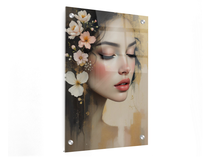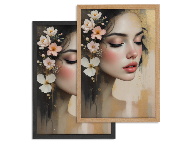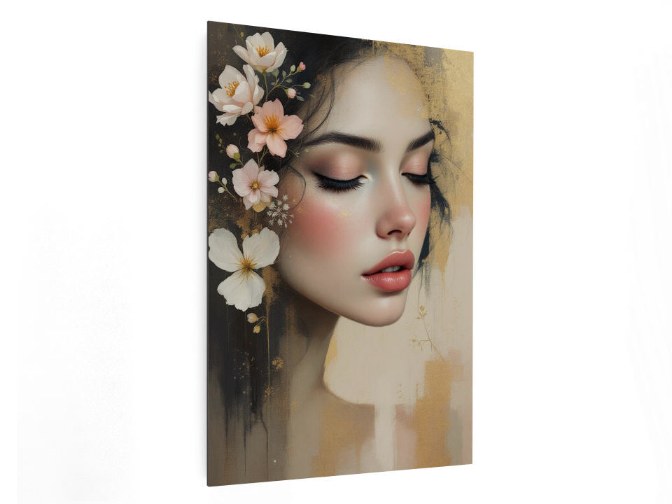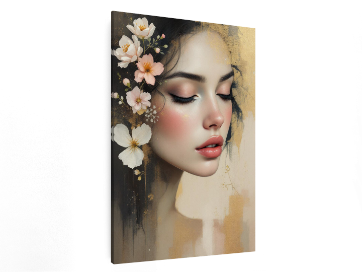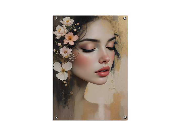 Abstract bloemig vrouwenportret, serene vrouwelijke expressie, bloemen versmelten met het gezicht, pastelkleuren met warme zand- en taupe tinten, subtiele goud texturen, moderne kunst print voor interieur, rustige en poëtische sfeer, matte schilderachtige afwerking.