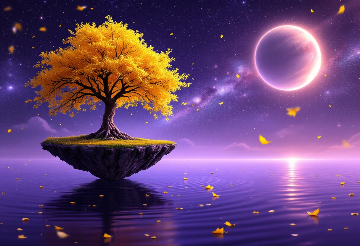 A floating island, with a beautiful yellow ginkgo tree on it, floating above a purple lake, rimples are formed in the lake by the invisible force that makes the island float, and yellow leafs are scattered on the water, in the background there is a deep space scenery with lots of stars and a distant planet that is visible, make all details insanely realistic